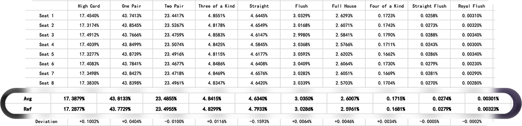 The table above compares hand probabilities from ​​1 million simulated 9-handed games​​ on CHIPCHIP against mathematical expectations. The observed average probabilities for all hand types closely align with their mathematical expectations. Results confirm that our algorithm meets strict randomness requirements.